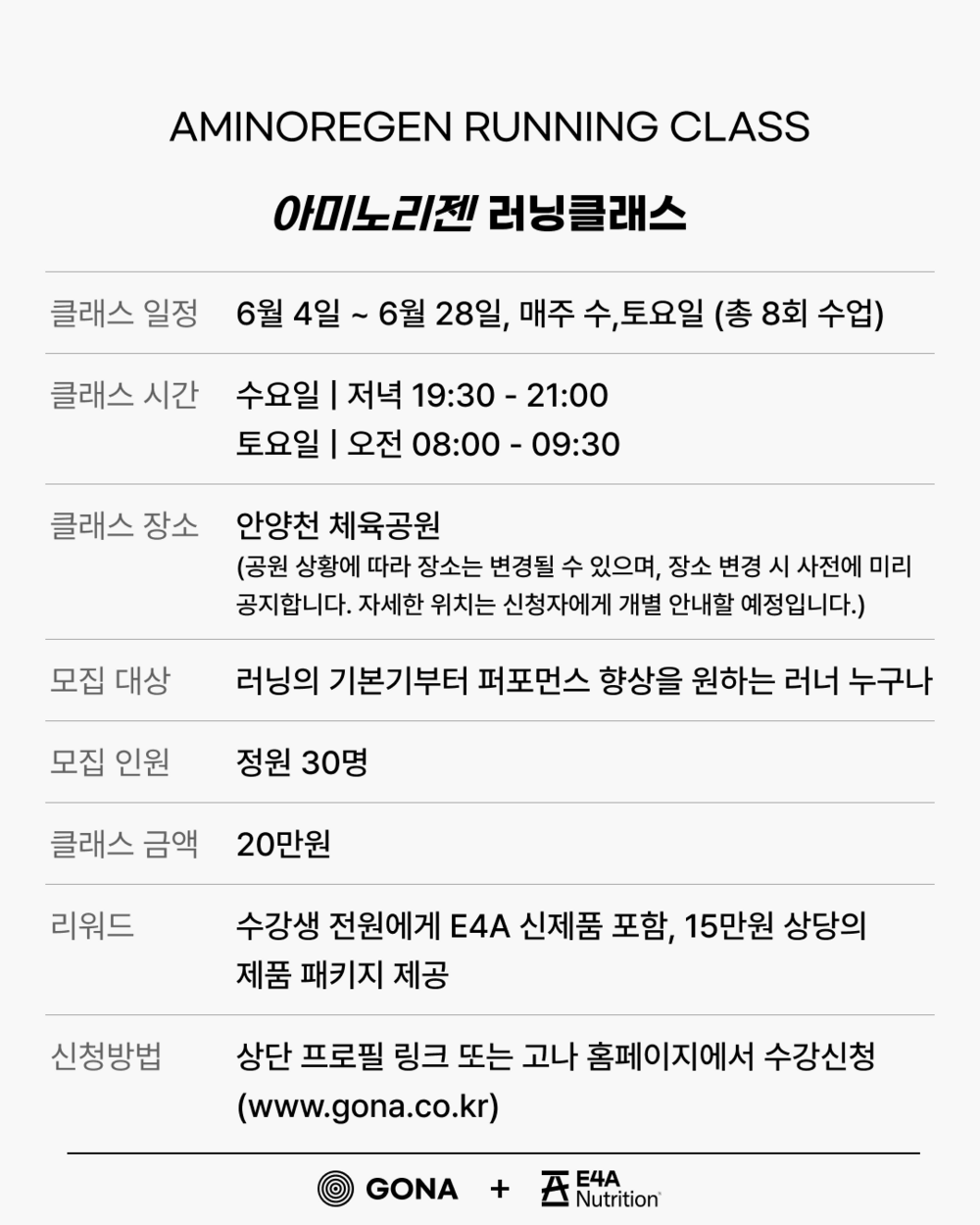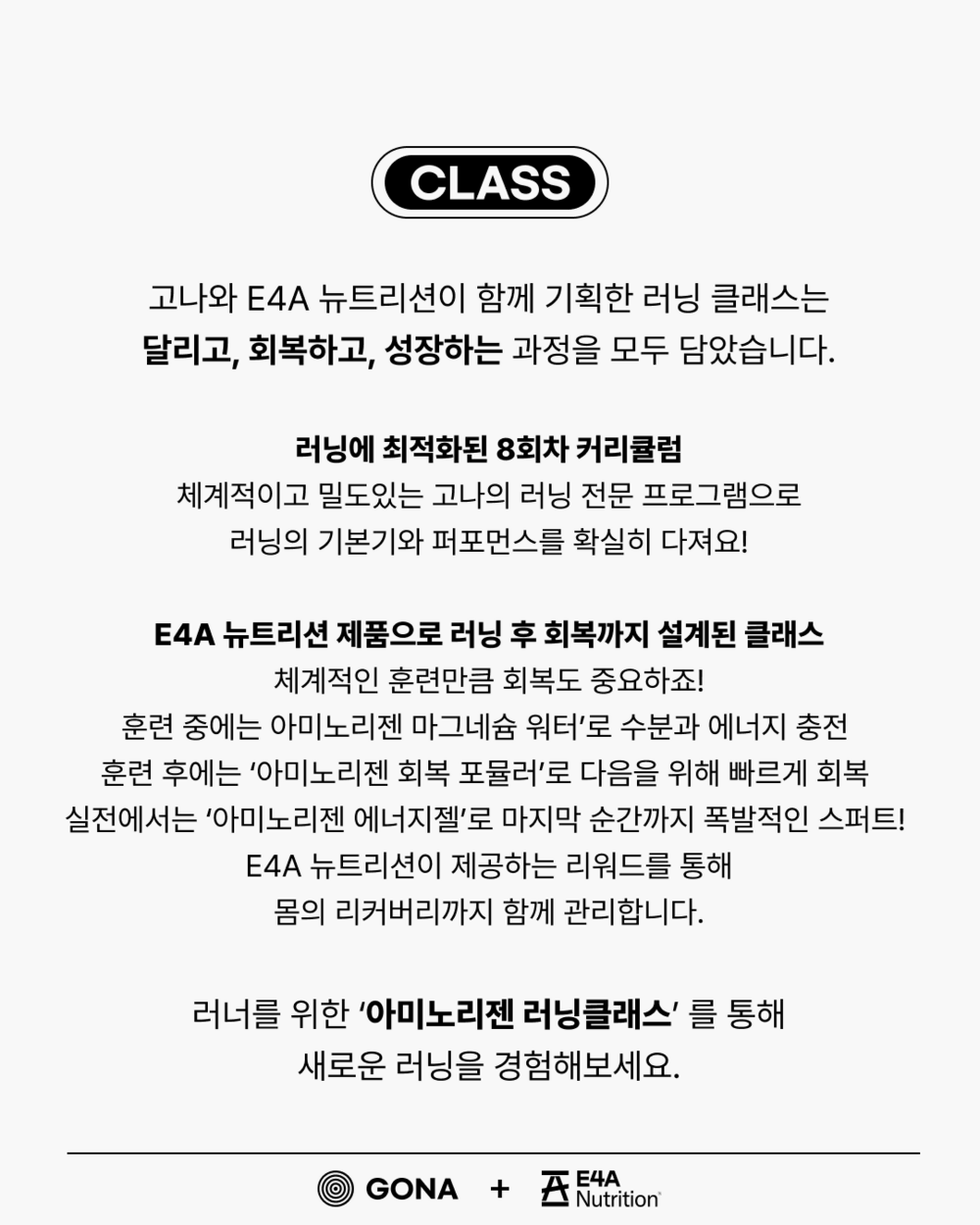 고나와 E4A 뉴트리션이 함께 기획한 러닝 클래스는 달리고, 회복하고, 성장하는 과정을 모두 담았습니다.