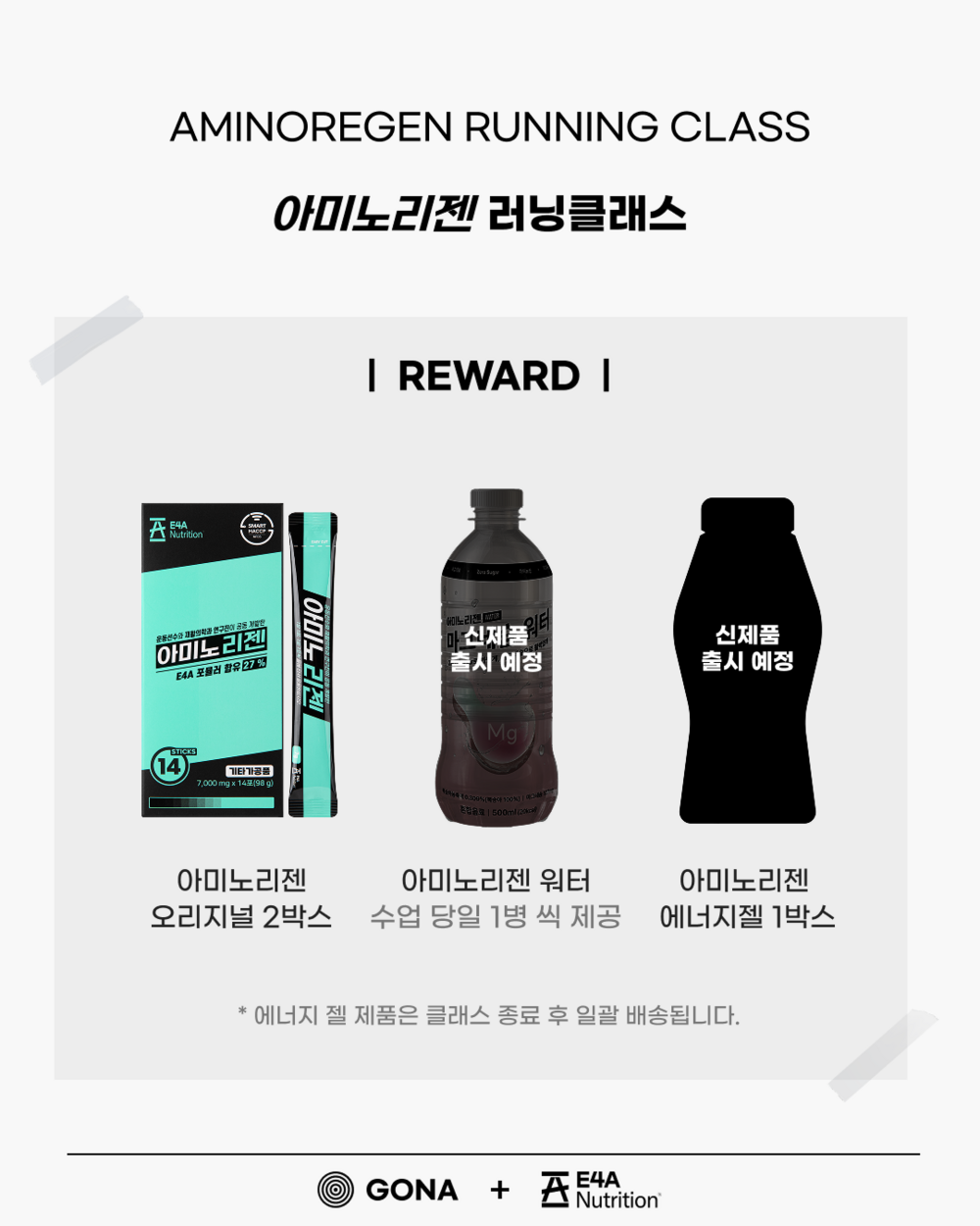 ✔️ E4A 뉴트리션 제품으로 러닝 후 회복까지 설계된 클래스 체계적인 훈련만큼 회복도 중요하죠! 훈련 중에는 아미노리젠 마그네슘 워터’로 수분과 에너지 충전 훈련 후에는 ‘아미노리젠 회복 포뮬러’로 다음을 위해 빠르게 회복 실전에서는 ‘아미노리젠 에너지젤’로 마지막 순간까지 폭발적인 스퍼트! E4A 뉴트리션이 제공하는 리워드를 통해 몸의 리커버리까지 함께 관리합니다.