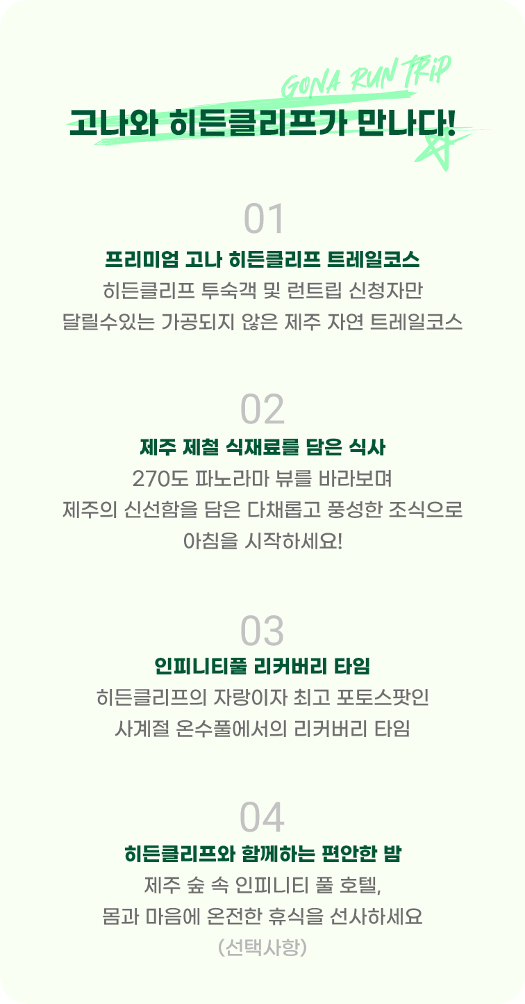 히든클리프 투숙객만 누릴 수 있는 숨겨진 히든 트레일 산책로를 고나와 함께 달려보세요~‼️