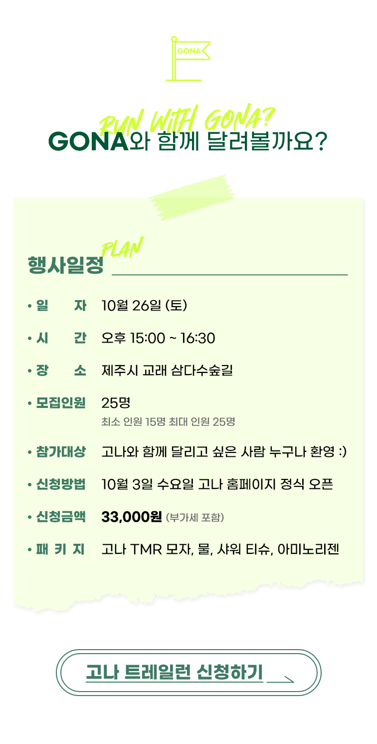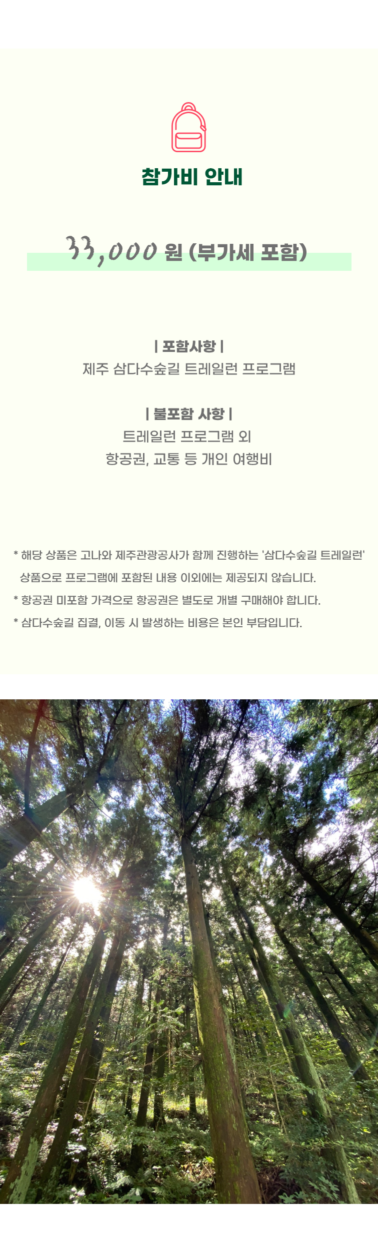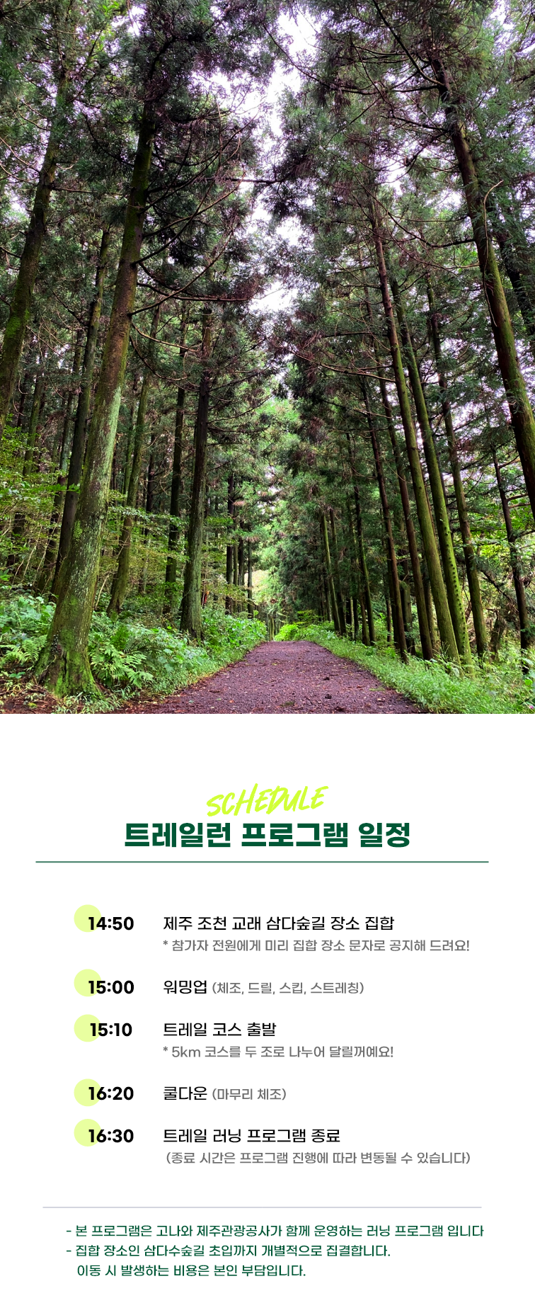 아직 사람들의 발길이 많이 닿지 않아 태고의 자연미를 느낄 수 있는 삼다수 숲길에서 자연의 숨결을 느끼며 고나와 함께 달려보아요! 제주에서의 특별한 경험이 여러분을 기다립니다!